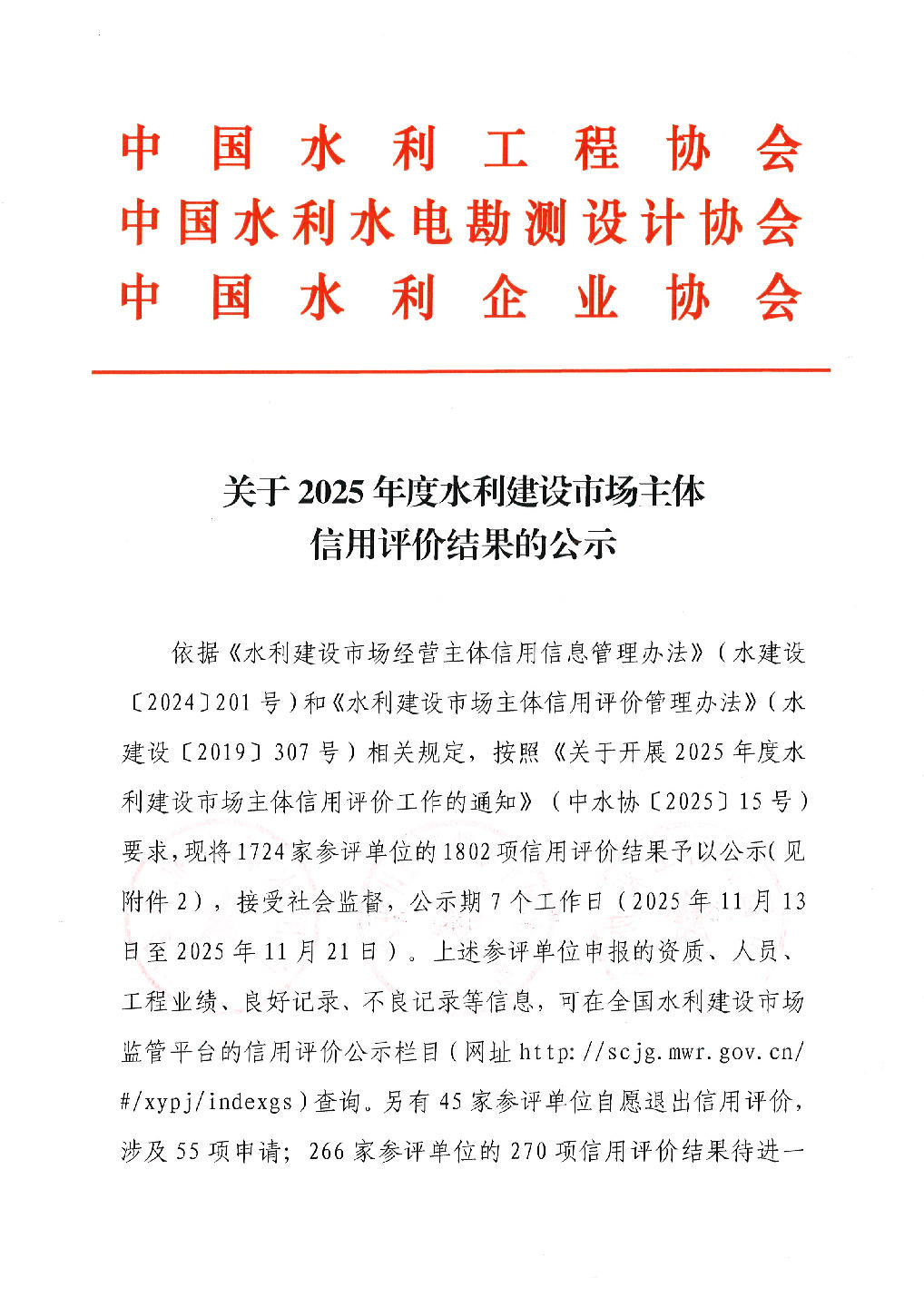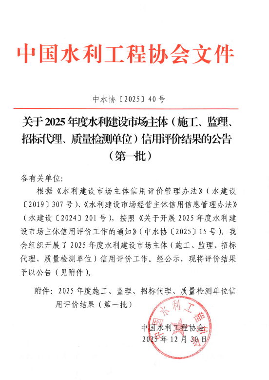 关于2025年度水利建设市场主体(施工、监理、招标代理、质量检测单位)信用评价结果的公告(第一批)发布时...